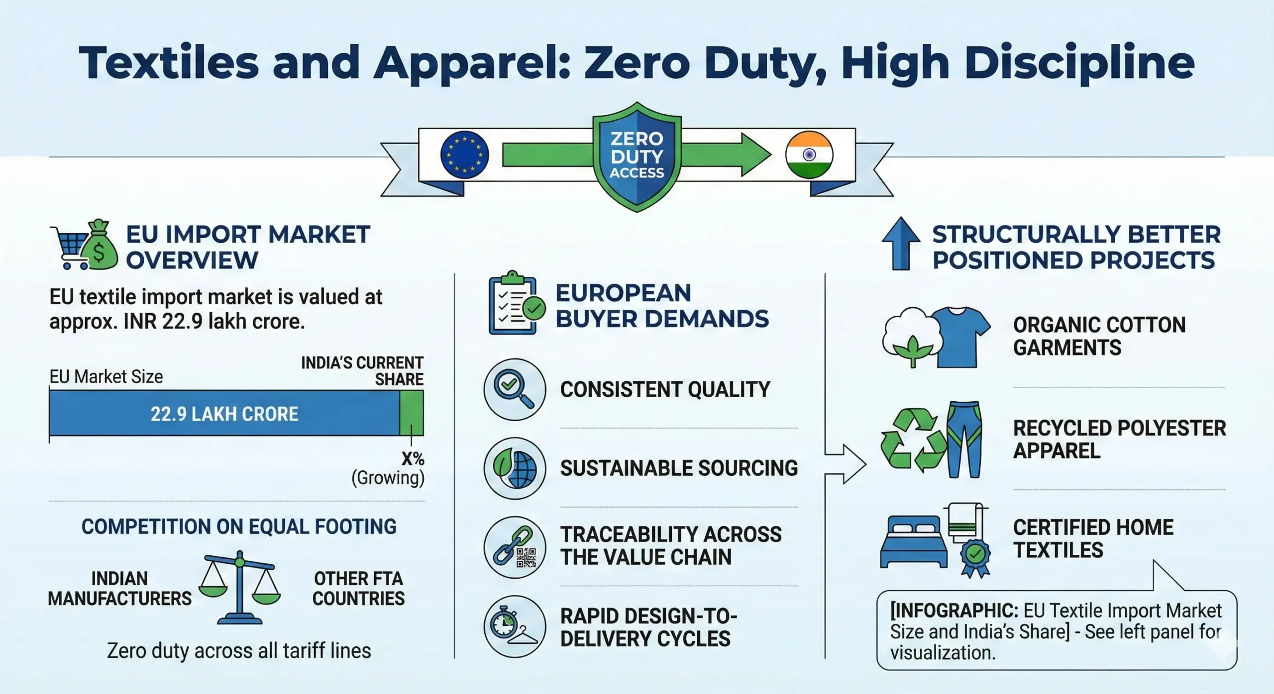 The EU textile import market is valued at approximately INR 22.9 lakh crore. With zero duty access across all tariff lines, Indian manufacturers now compete on equal footing with suppliers from other FTA countries.