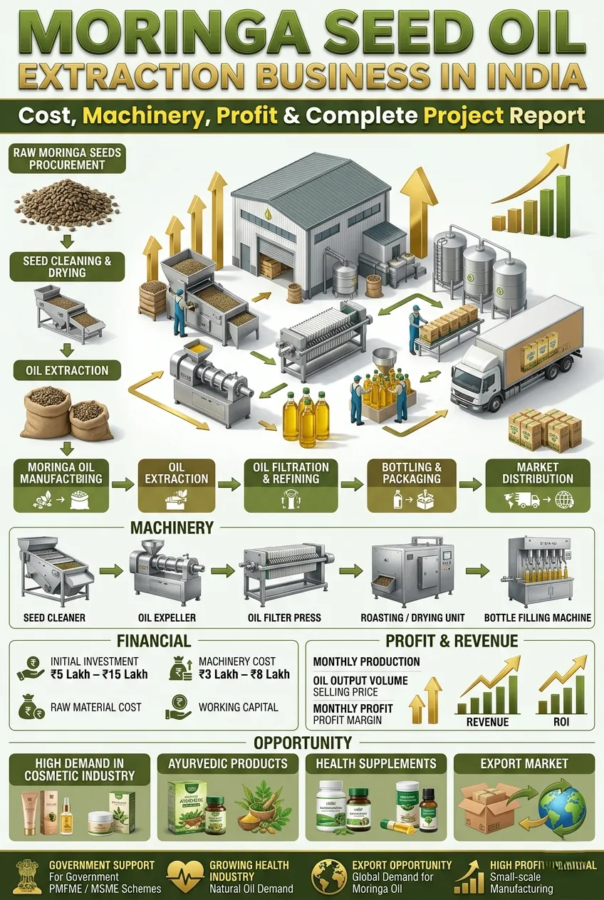 The seed oil extraction of moringa business is emerging as one of the rapidly expanding business opportunities in the Indian agro processing industry. As the world continues to demand natural, chemical-free and plant-based oils, moringa oil has been highly utilized in the cosmetics, pharmaceutical and wellness market.
